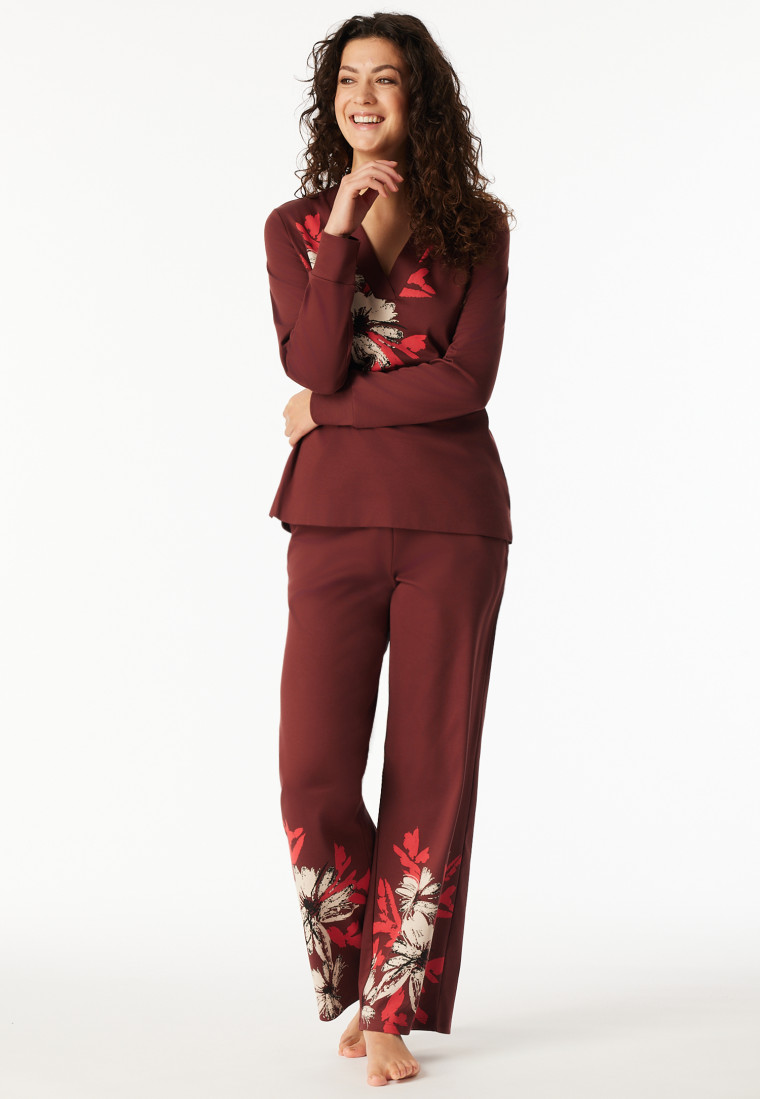 Schlafanzug lang Interlock V-Ausschnitt Blumen burgund - Comfort Interlock