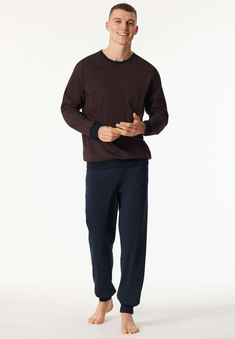 - long, dark blue men's pyjamas with patterned long sleeve shirt in red-brown