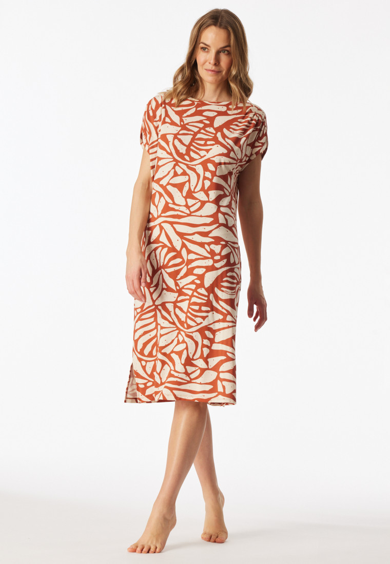 - short-sleeved, terracotta-colored women's nightgown with a modern pattern in cream