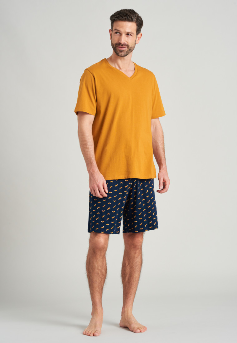Diese nachtblauen Bermudashorts sind für modebegeisterte Herren ein Must-have. Denn mit dem mittelbraunen Dackel-Muster werden die Shorts zum witzigen Blickfang. Eine lockere Passform sowie softer Feininterlock aus 100 % Baumwolle runden den Look ab. Als praktische Details erweisen sich die seitlichen Taschen und das nachtblaue Bindeband am elastischen Bund. Ideal für entspannte Tage und Nächte!