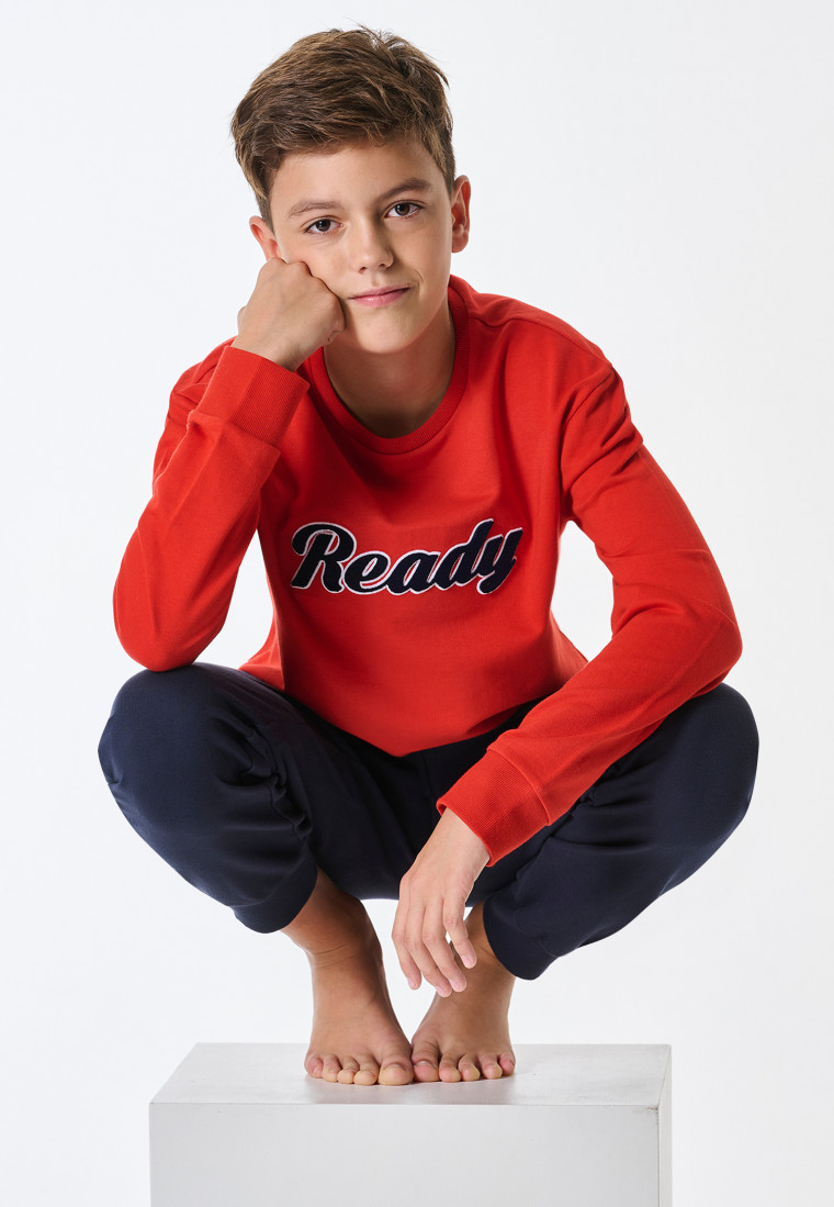 • pigiama da ragazzo lungo con maglietta rossa e scritta "ready", pantaloni in blu scuro