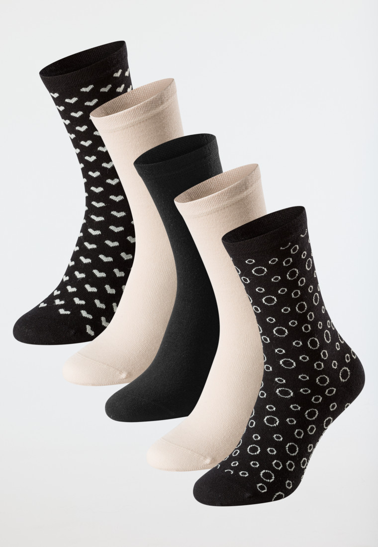 • Calzini per donna (2 beige, 1 nero, 1 nero con cuori, 1 nero con punti)