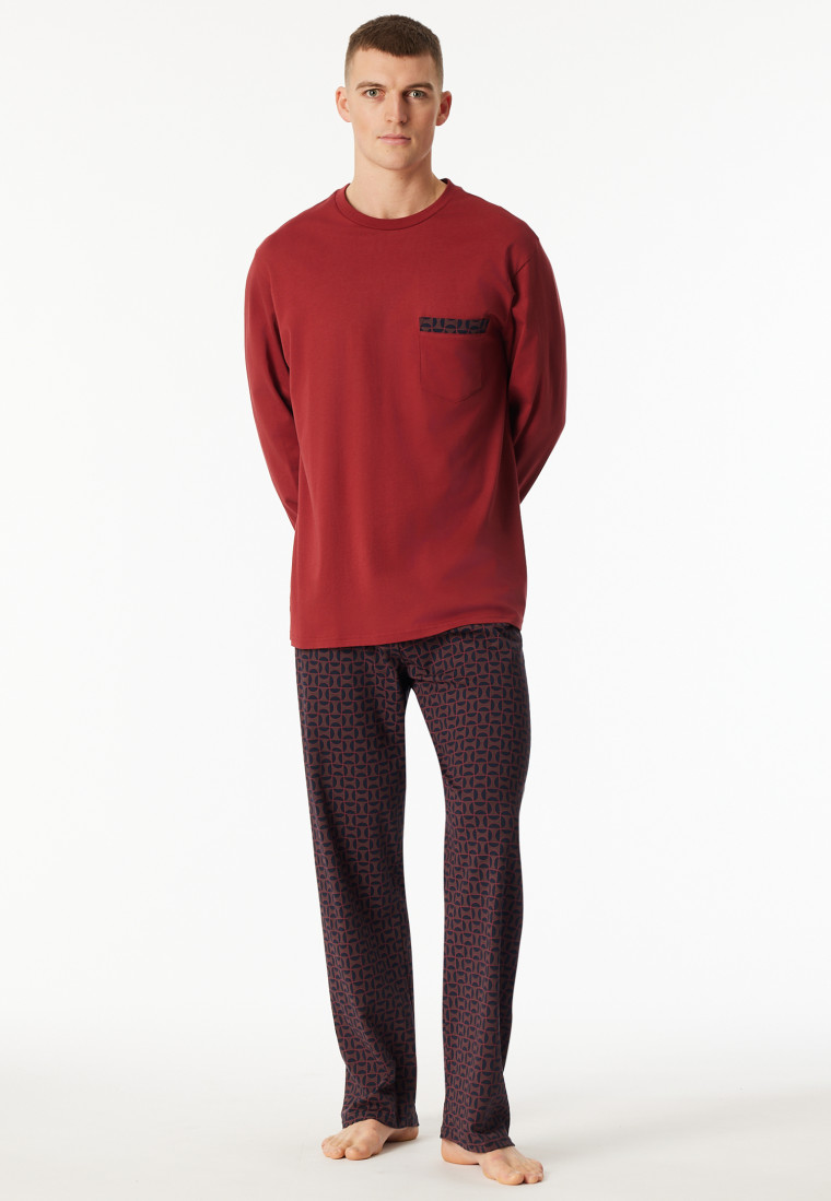 • pigiama lungo da uomo con maglietta rosso scuro e pantaloni a fantasia in grigio brunastro