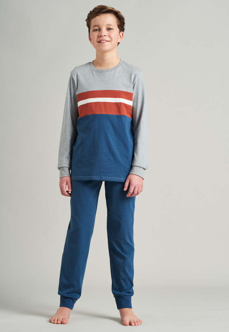 Dieser lange Jungen-Schlafanzug sieht nicht nur cool aus, sondern ist auch noch super soft auf der Haut! Das blau-graue Langarmshirt wird mit dem Colour-Blocking in Off-white und Rost zum echten Hingucker. Fehlen nur noch die blaue Schlafhose, bequeme Bündchen und 100 % Organic Cotton - fertig ist der lässige Lieblingsschlafanzug für topmodische Teens in bester SCHIESSER-Qualität!