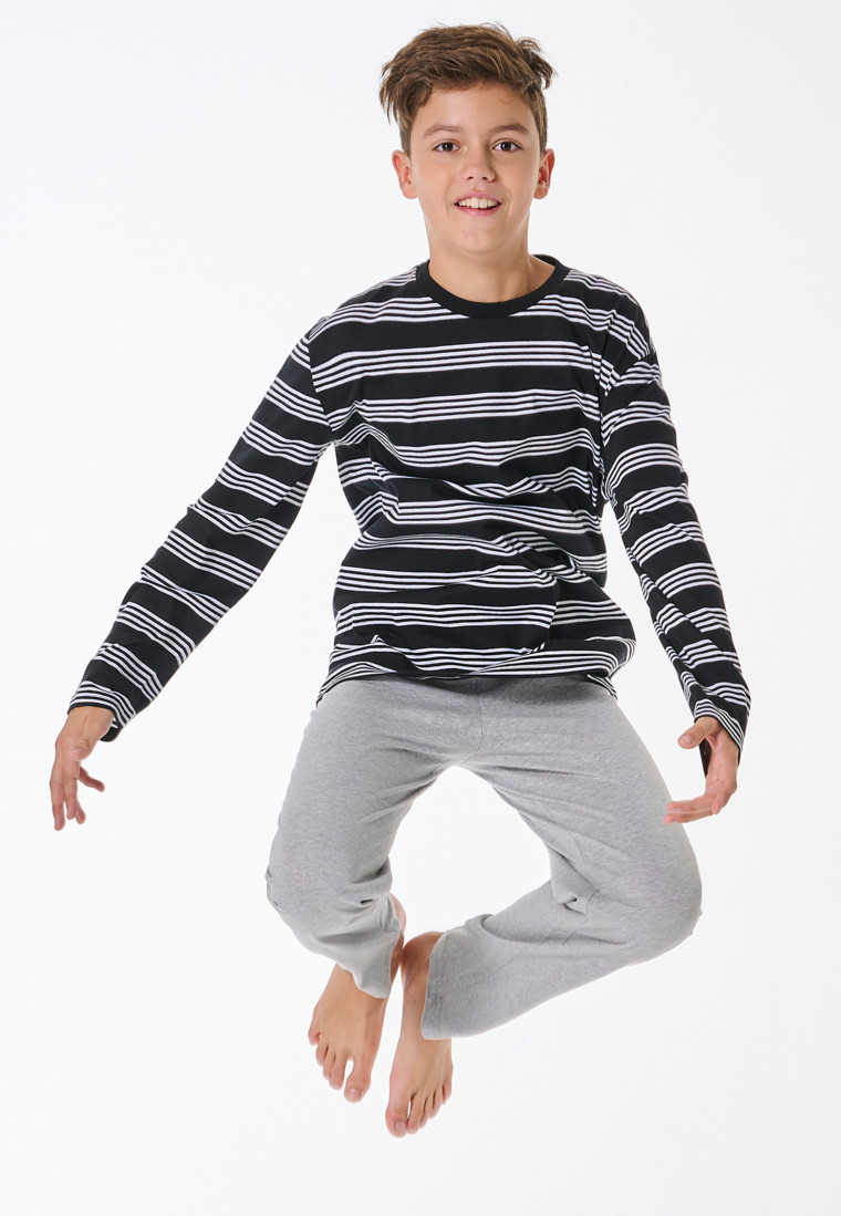 • langer Jungenschlafanzug mit schwarz-weiß geringeltem Shirt und Hose in Graumelange