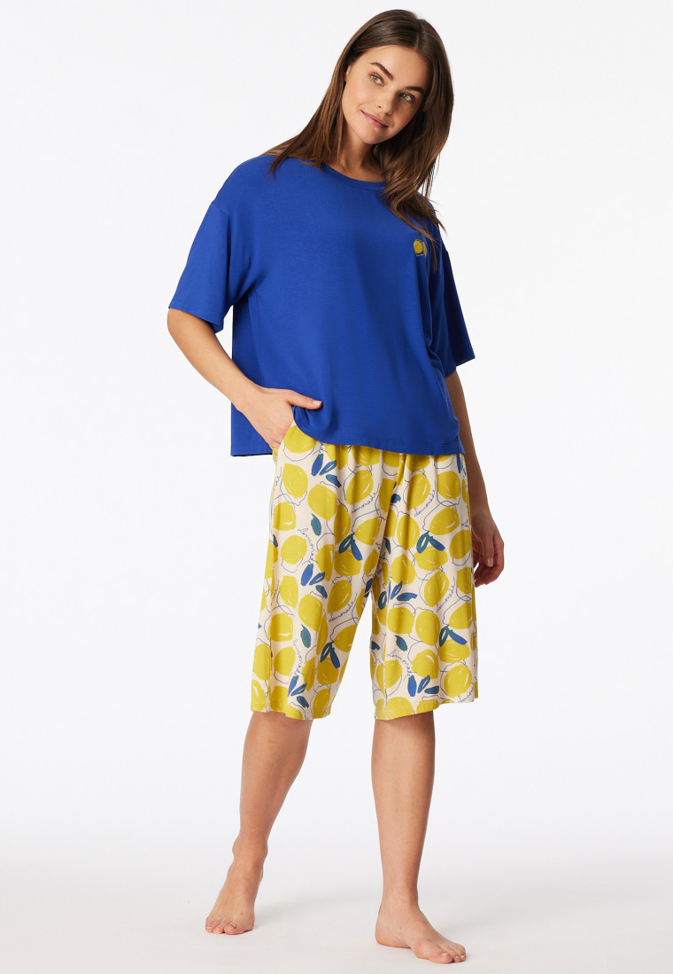 • 3/4-langer Damenschlafanzug in Royalblau und Gelb, mit trendigem Zitronen-Motiven auf Shirt und Hose